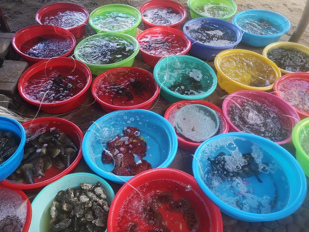 In einem Fischerdorf muss natürlich auch dem entsprechend gespeist werden. Bei Eintritt ins Restaurant kann zwischen diversen Meeresfrüchten gewählt werden. Dann muss man sich noch für die Art der Zubereitung entscheiden und dann heißt es, sich überraschen lassen, was man bestellt hat.