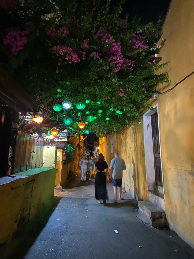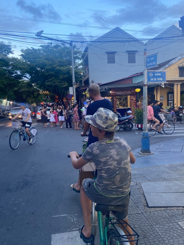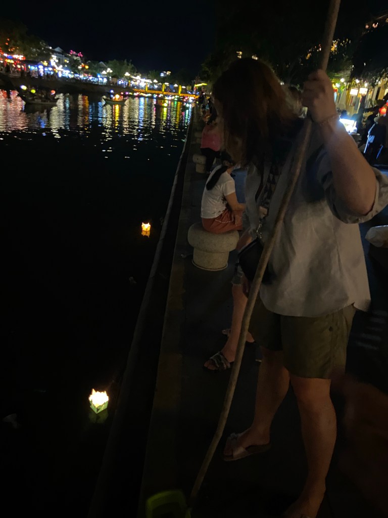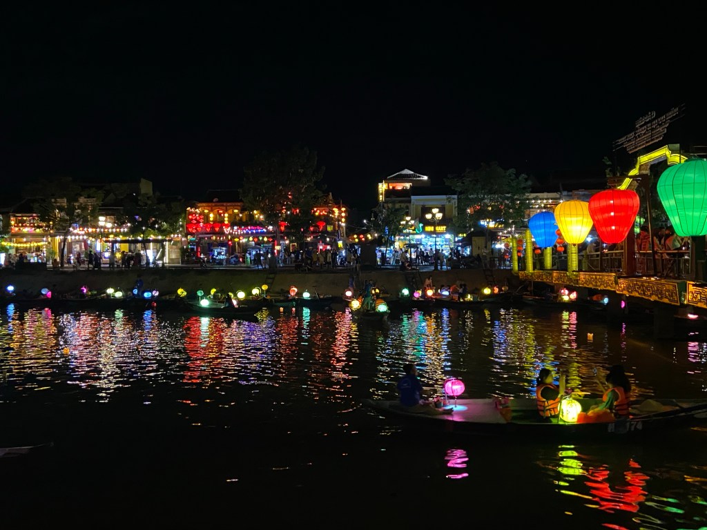 Wir hatten Glück, da wir zu einer besonderen Zeit in der Stadt waren. Das Vollmond-Festival in der Altstadt von Hoi An feiert die Mondgottheit mit begrenztem Gebrauch der elektrischen Beleuchtung, mit Seidenlaternen, um die Häuser und Straßen stattdessen zu beleuchten. Papierschalen mit Kerzen wurden in den Fluss gesetzt und die ebenfalls mit Lampions geschmückten Boote luden zu einer Fahrt auf dem Fluss ein. Uns hat allerdings der Gedanke bei 95 grad auch noch eine Schwimmweste tragen zu müssen, abgeschreckt.