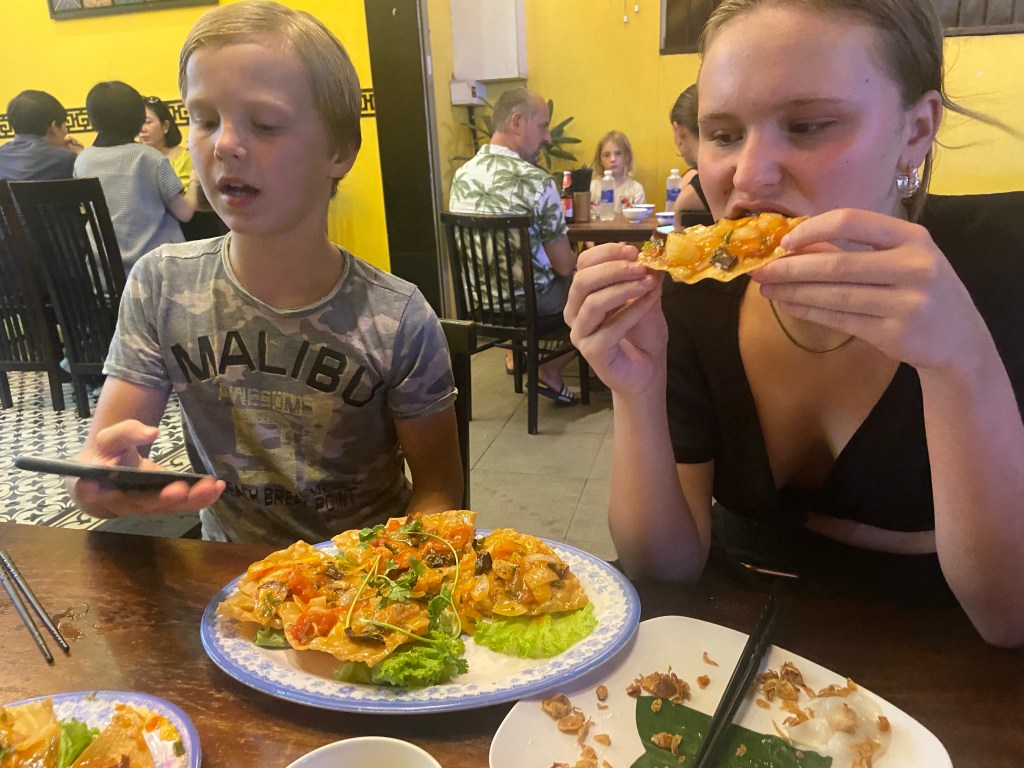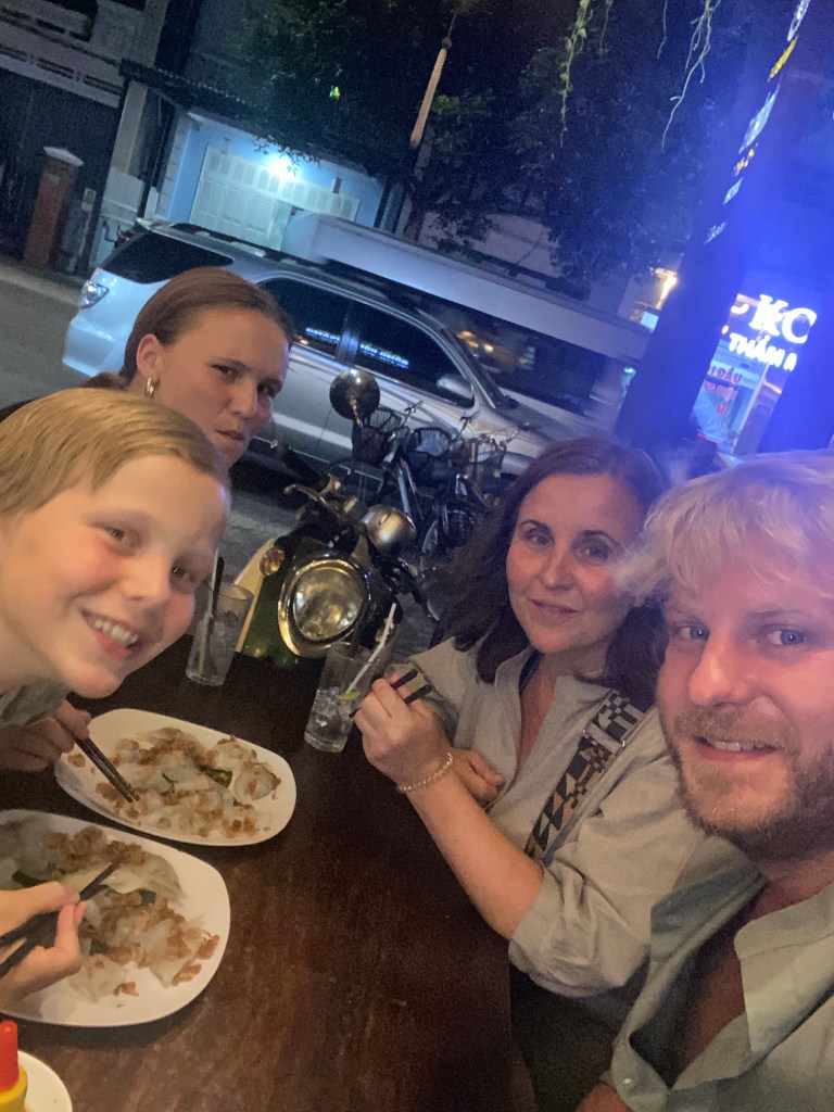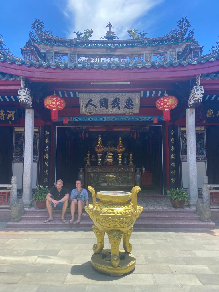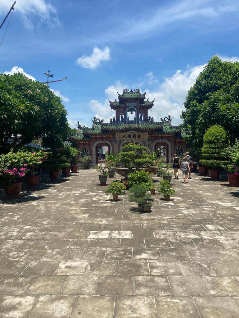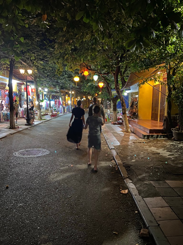 Wir hatten Glück, da wir zu einer besonderen Zeit in der Stadt waren. Das Vollmond-Festival in der Altstadt von Hoi An feiert die Mondgottheit mit begrenztem Gebrauch der elektrischen Beleuchtung, mit Seidenlaternen, um die Häuser und Straßen stattdessen zu beleuchten. Papierschalen mit Kerzen wurden in den Fluss gesetzt und die ebenfalls mit Lampions geschmückten Boote luden zu einer Fahrt auf dem Fluss ein. Uns hat allerdings der Gedanke bei 95 grad auch noch eine Schwimmweste tragen zu müssen, abgeschreckt.